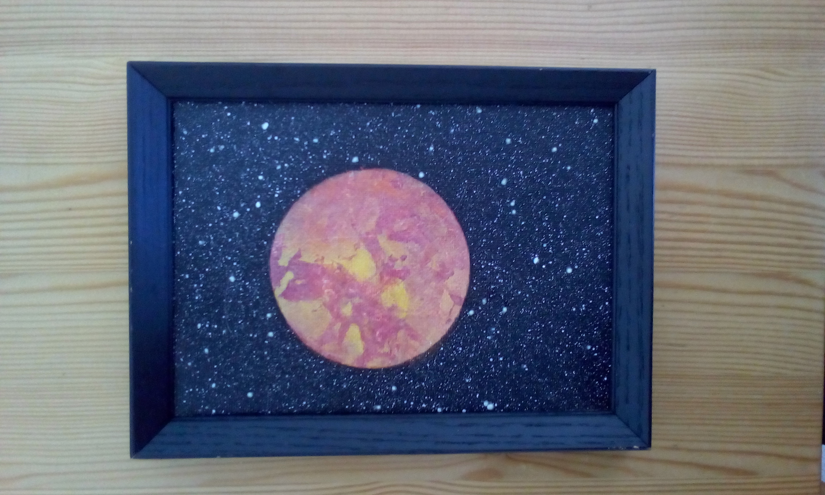 8″x10″ acrylic cosmic scene of a red/orange distant planet and stars that light up for varying times in the dark on a ready to prop or hang framed canvas.