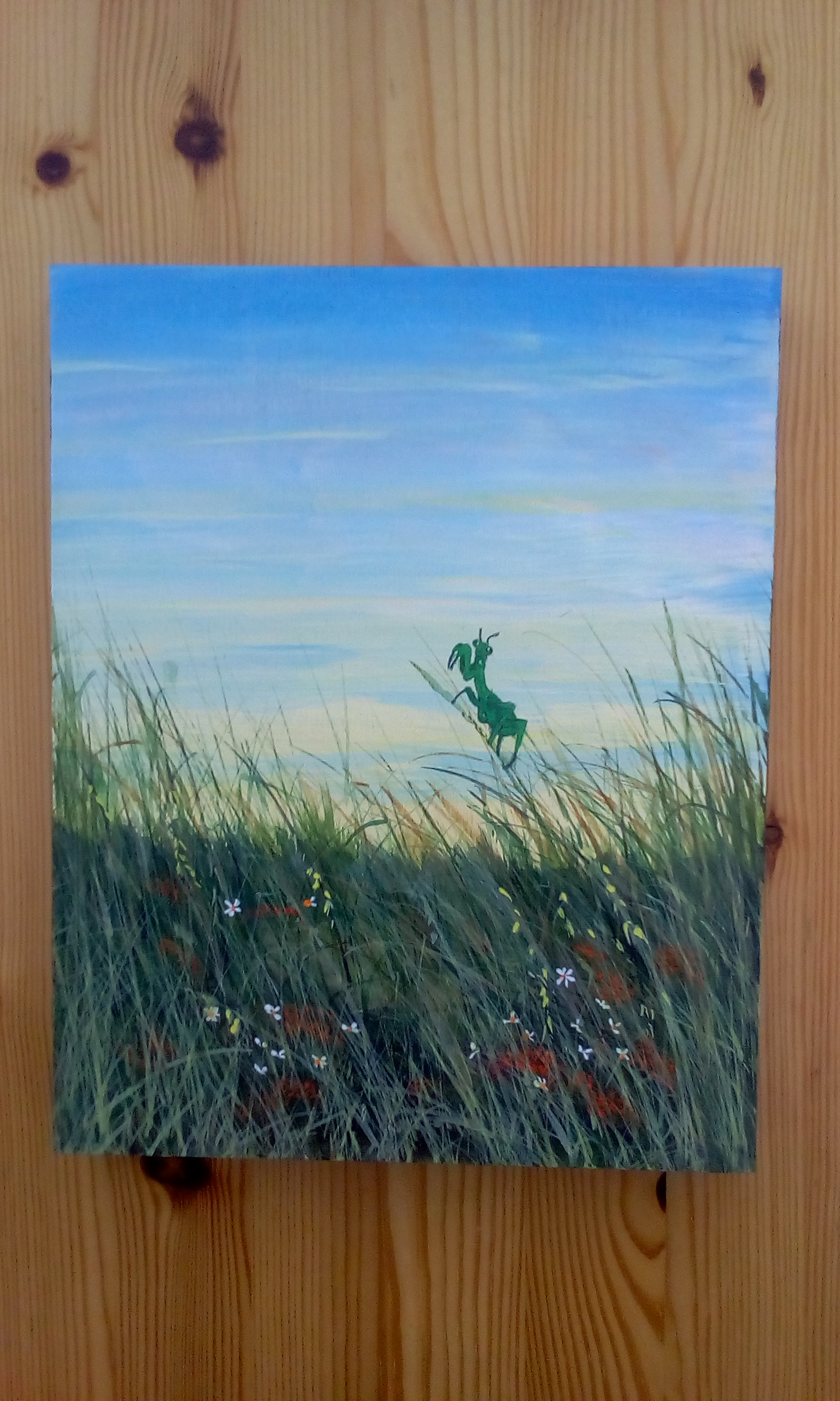 8″x10″ acrylic landscape with praying mantis on blade of grass on a ready to hang wood panel
