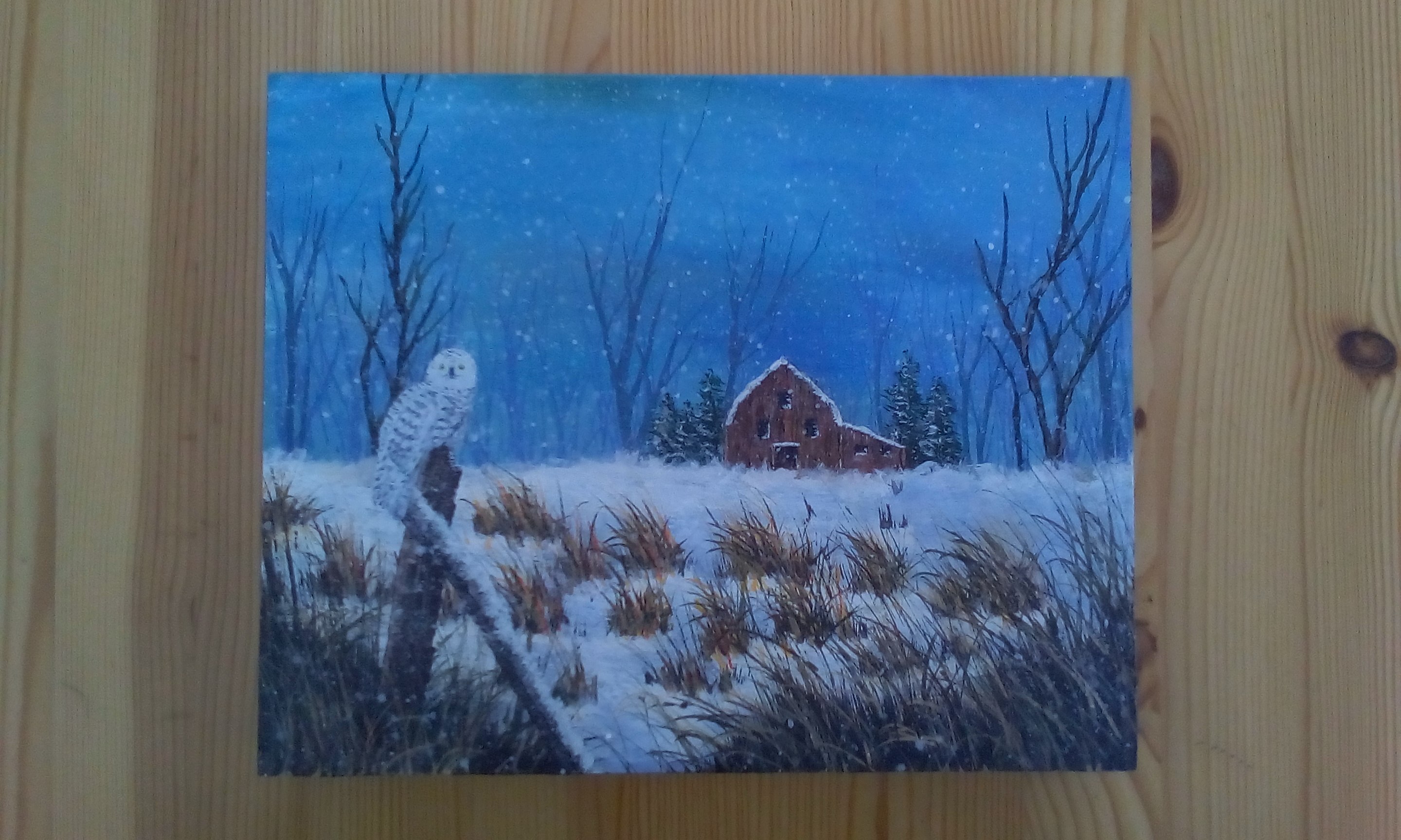 8″x10″ acrylic winter landscape with snowy owl on a farm post on ready to hang wood panel